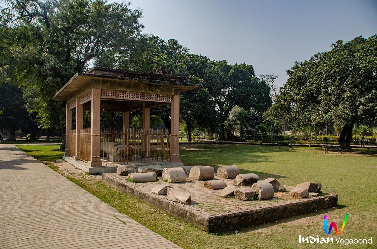 Các mảnh đá của 80 cột trụ đá của hội trường,  nơi diễn ra Đại hội kết tập Tam Tạng lần thứ 3, ở Kumrahar, được trưng bày tại Patna ngày nay.